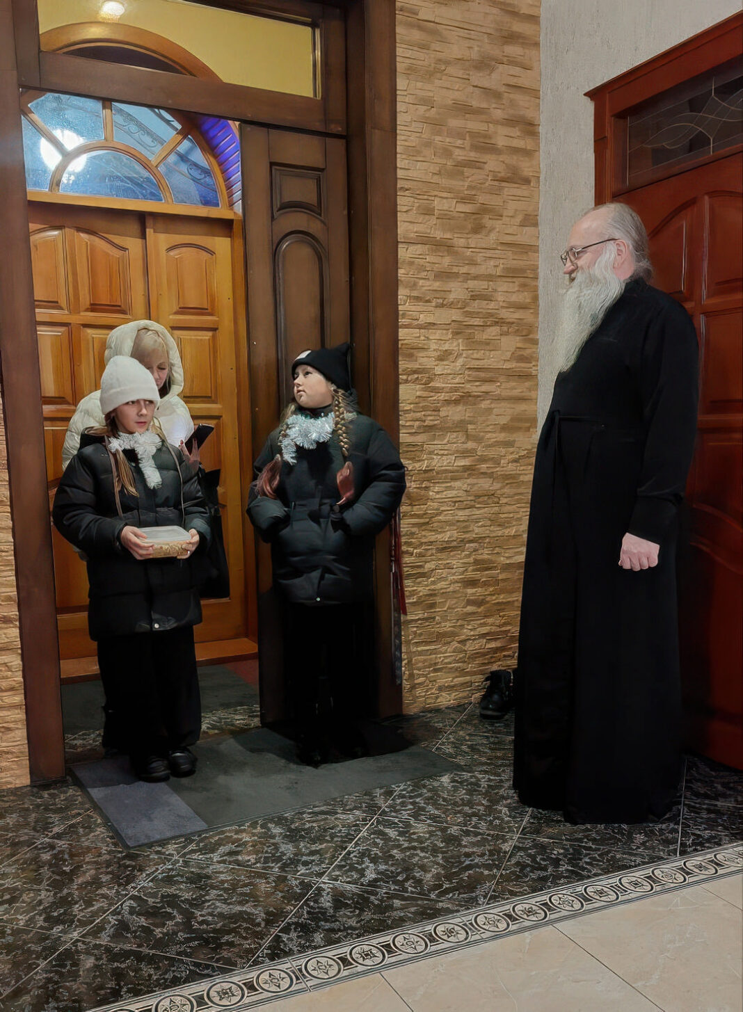 Сегодня 6 января, 2026 г. в сочельник Рождества Христова настоятеля Свято-Вознесенского храма протоиерея Иакова Лобова по уже сложившейся традиции пришли поздравить и принесли кутию дети г. Александровска. Юные благовестники родившегося Богомладенца получили сладкие подарки и вознаграждения.